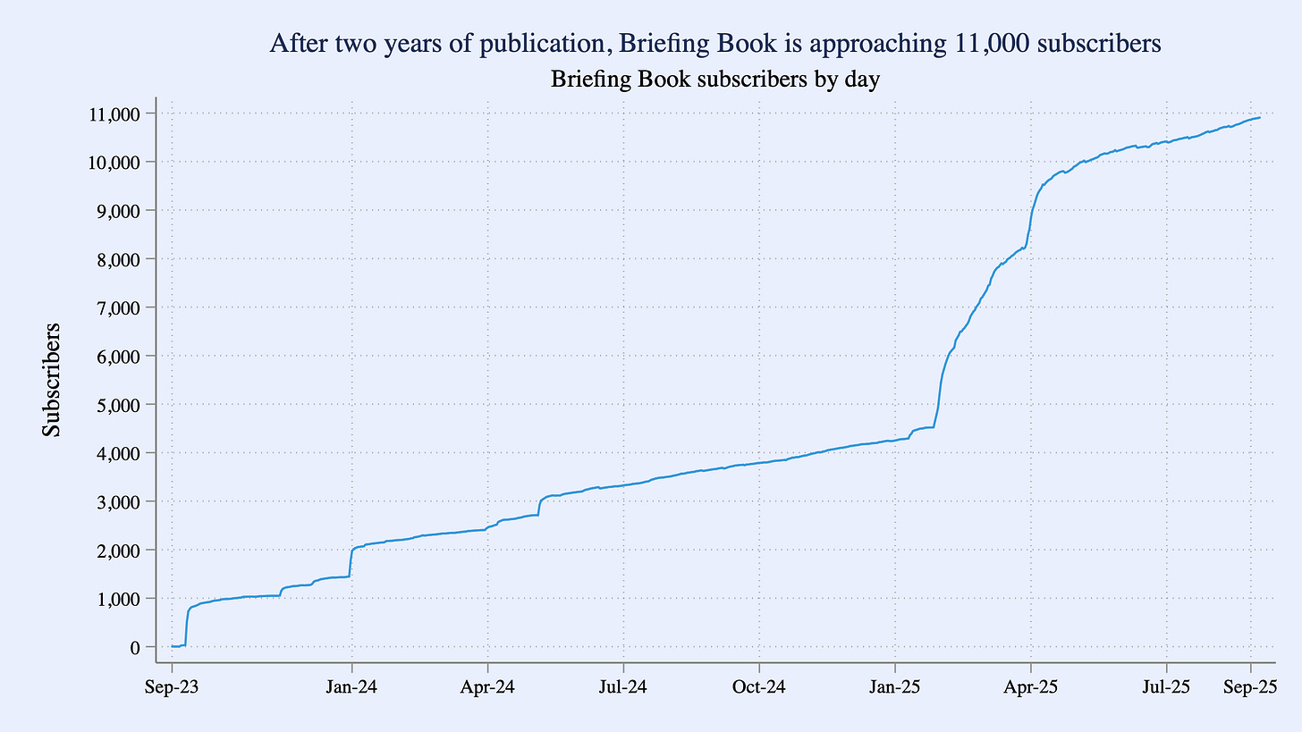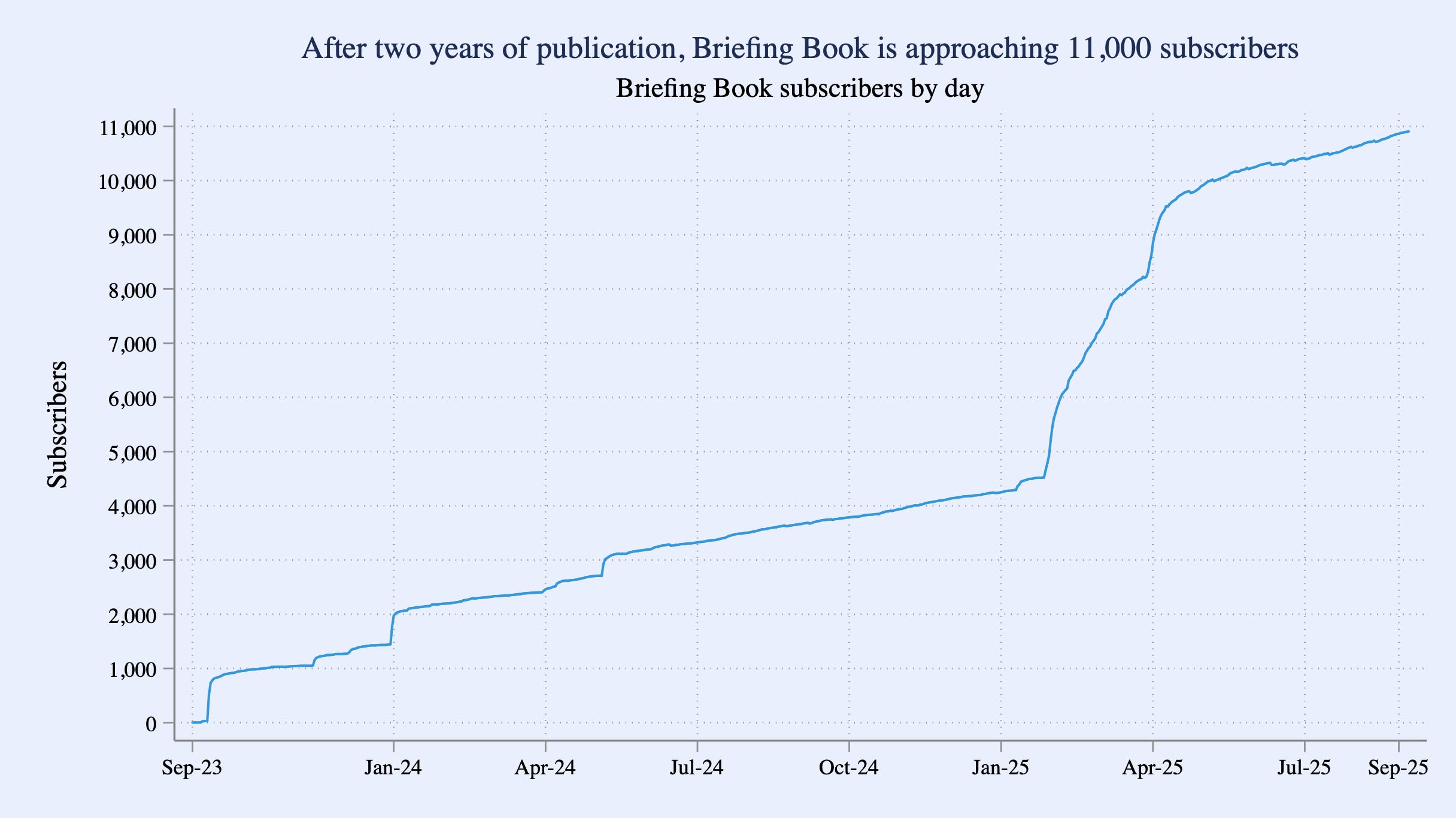 We started Briefing Book two years ago with Kevin Rinz and Jeffery Zhang to bring this type of analysis to the public. In the two years since, we’ve been lucky to amass a network of 47 terrific contributors, listed here. Together, we’ve published 67 posts on topics like child care, tax cuts, gas prices, tariffs, infrastructure, Social Security, cryptocurrency, and health care, to name a few. Our audience has grown from 823 when our first post was published, to nearly 11,000 today.