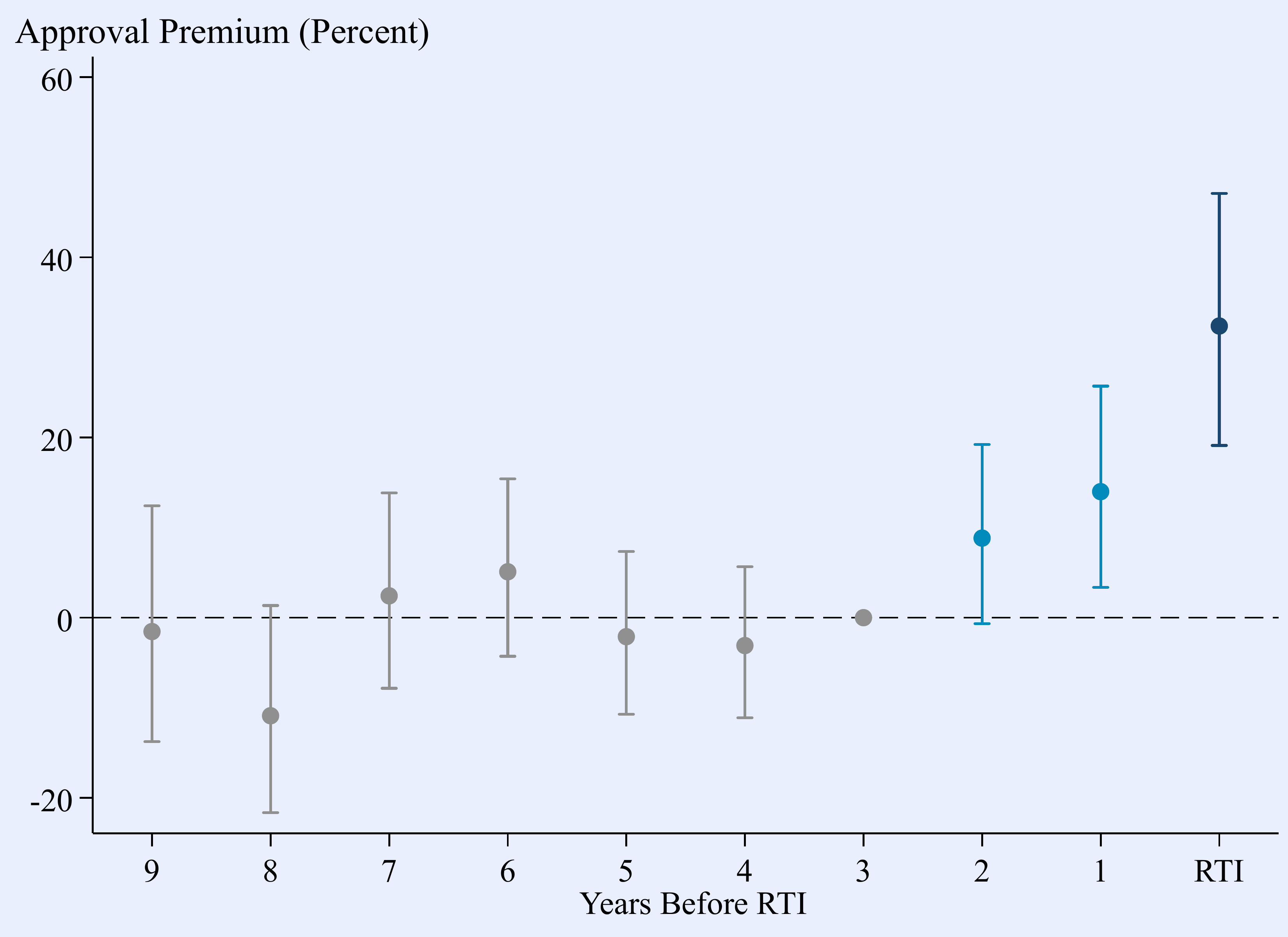 Note: Dots report event study estimates of price premiums for land that eventually receive permitting approval, by year prior to the ready-to-issue (RTI) permit approval. The reference period is three years prior to the RTI listing. The figure includes nine lead years before being fully approved. To estimate the approval premium, the event study compares changes over time in listing prices of properties that experienced a change in their permit status, controlling for contemporary price trends observed for listings that remain raw land. Bars indicate 95-percent pointwise confidence intervals, with standard errors clustered by parcel.