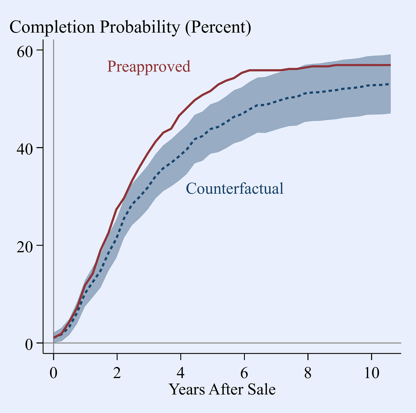 Note: This figure displays the estimated effects of preapproval on time to completion. Specifically, it plots the empirical cumulative completion hazard for preapproved properties (red solid line) and then subtracts off the estimated effects of preapproval to obtain the counterfactual completion profile in time (blue dashed line) The sample is all vacant properties that ever submit a permit. Color bands indicate 95-percent pointwise confidence intervals, with standard errors calculated by a nonparametric bootstrap clustered by property.