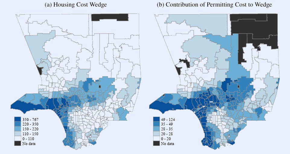 But in high-rent neighborhoods like Santa Monica, where home prices exceed construction costs by more than two to one, developers are willing to pay around 85 percent of construction costs just to skip permitting. Permitting is thus a major driver of the construction costs in places where other regulations already heavily distort housing supply.