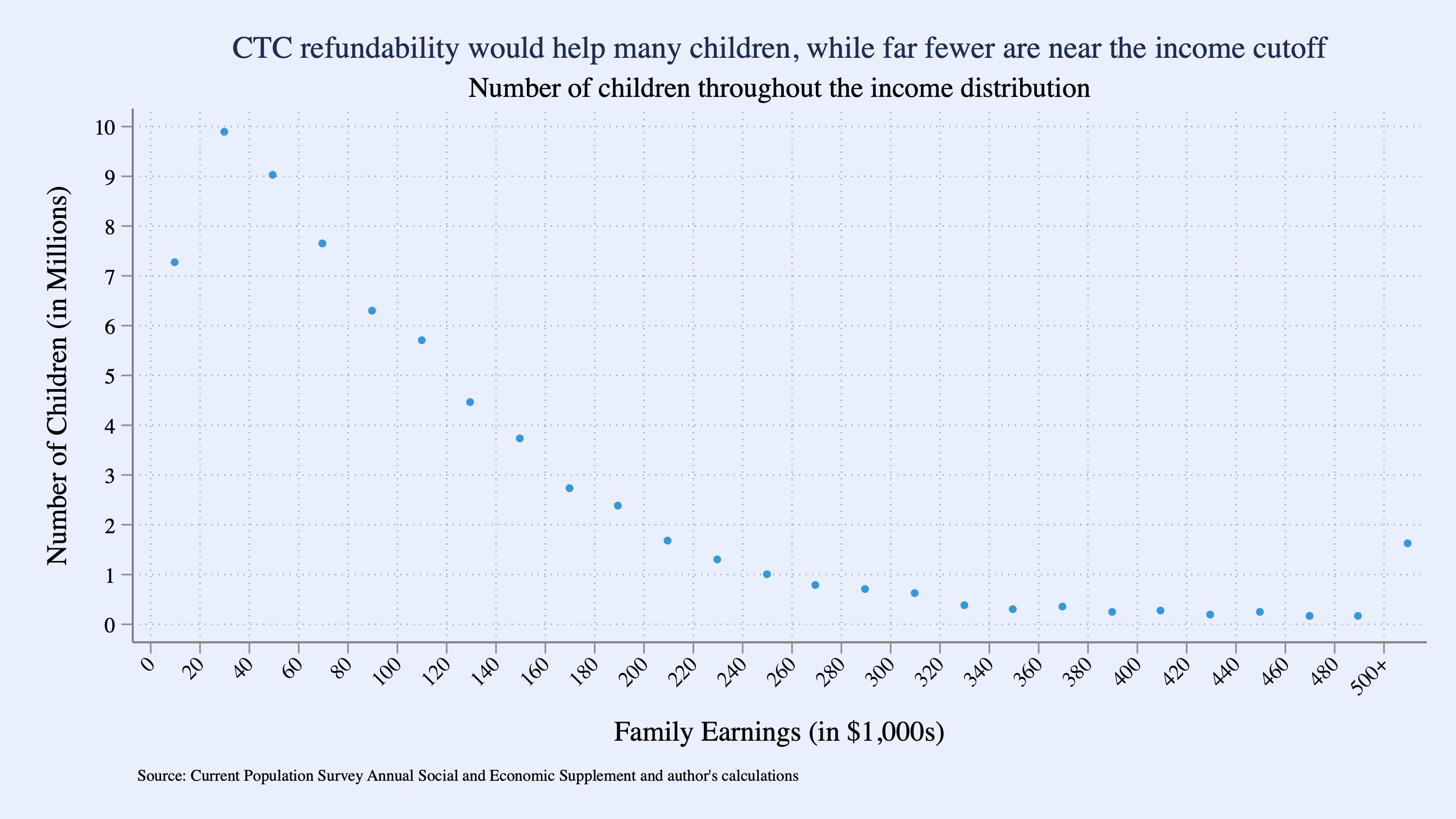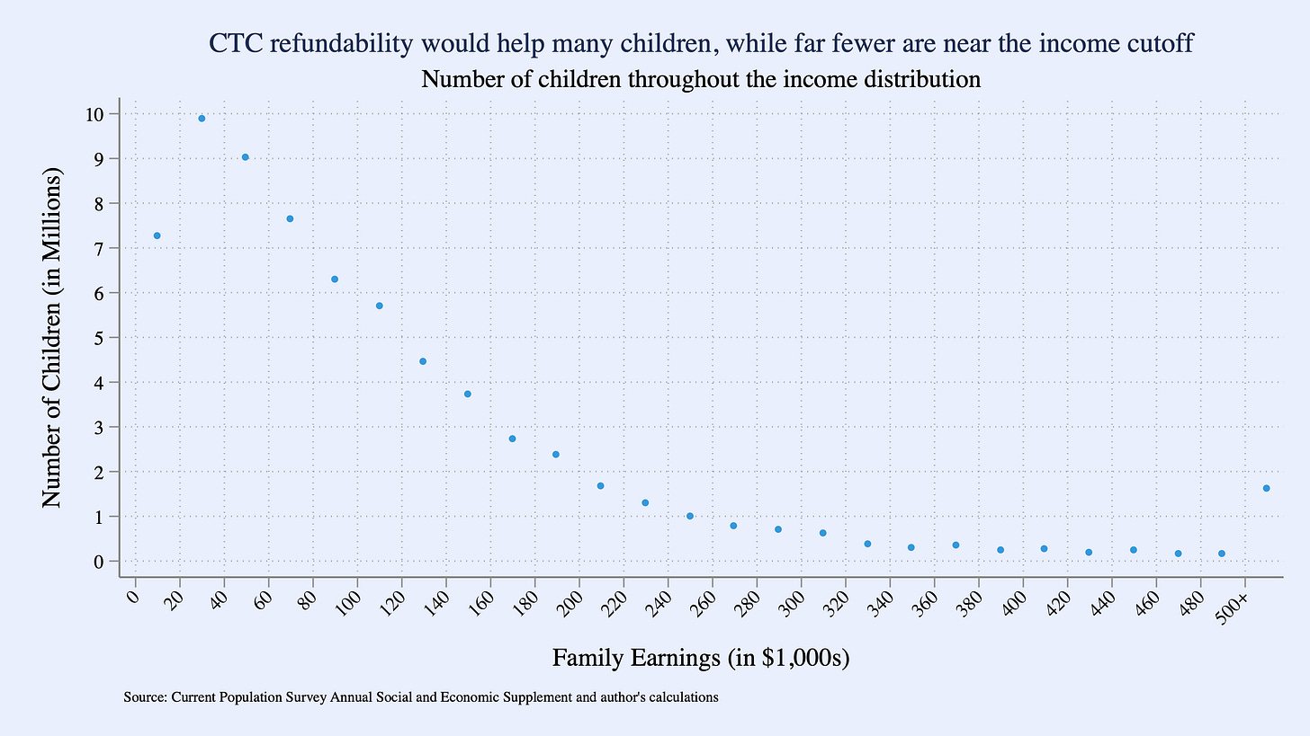 Figure 3 illustrates where children fall across the income distribution. Of the 69 million children under age 18 in the United States, more than 7 million live in families earning below $20,000 a year, and 40 million are in families with incomes under $100,000. In contrast, 10 million children live in households earning above $200,000, including 2.5 million in those above $400,000. These figures show that millions of children grow up in families with very low incomes—and highlight why expanding the refundable portion of the CTC would do far more to reach those most in need.