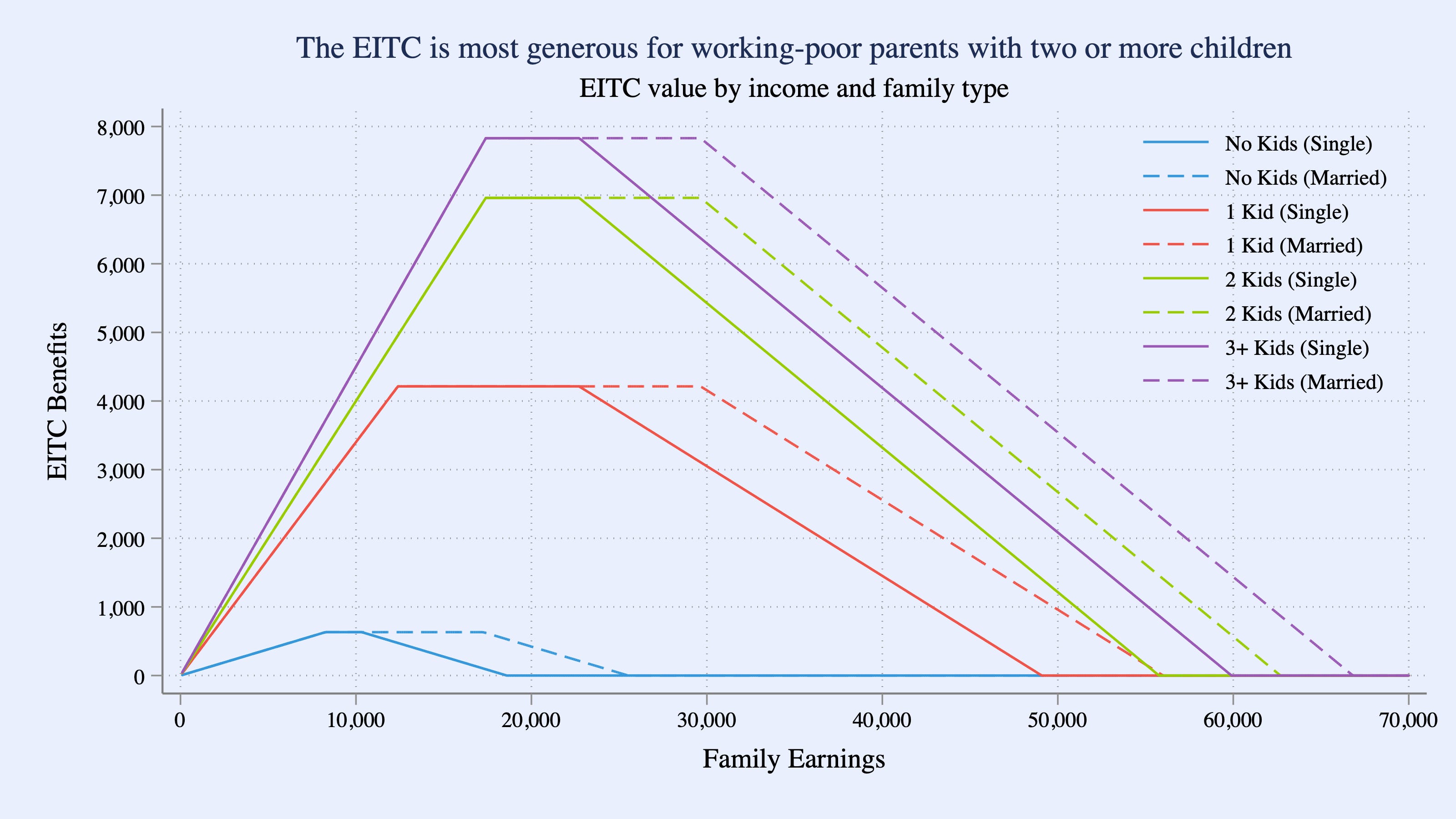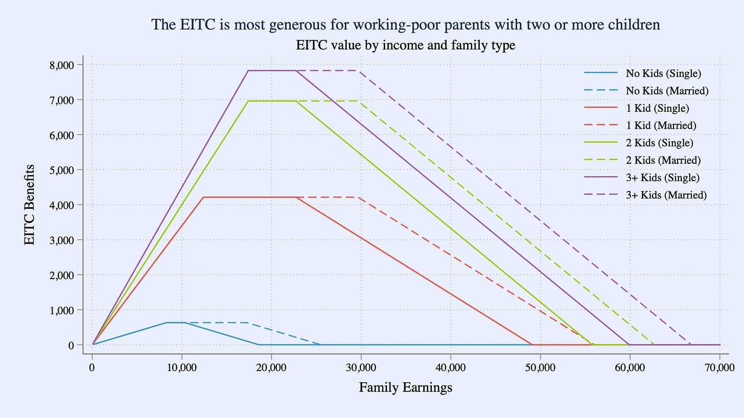 The EITC is a refundable tax credit that reaches about 25 million low- and moderate-income households and delivers roughly $60 billion in benefits each year. Designed to reward work and support families, the credit increases with earnings up to a threshold—rising by 34 cents per dollar for families with one child, 40 cents for those with two children, and 45 cents for families with three or more children—before plateauing for moderate-income households and gradually phasing out. Maximum benefits are about $8,000 for families with three or more children, $7,000 for those with two children, and $4,000 for those with one child, but only about $600 for those without qualifying children. Figure 1 illustrates the 2025 EITC and is based on IRS data. Because it is fully refundable, the EITC provides meaningful income support even to families with little or no tax liability—often representing a quarter or more of their annual income.