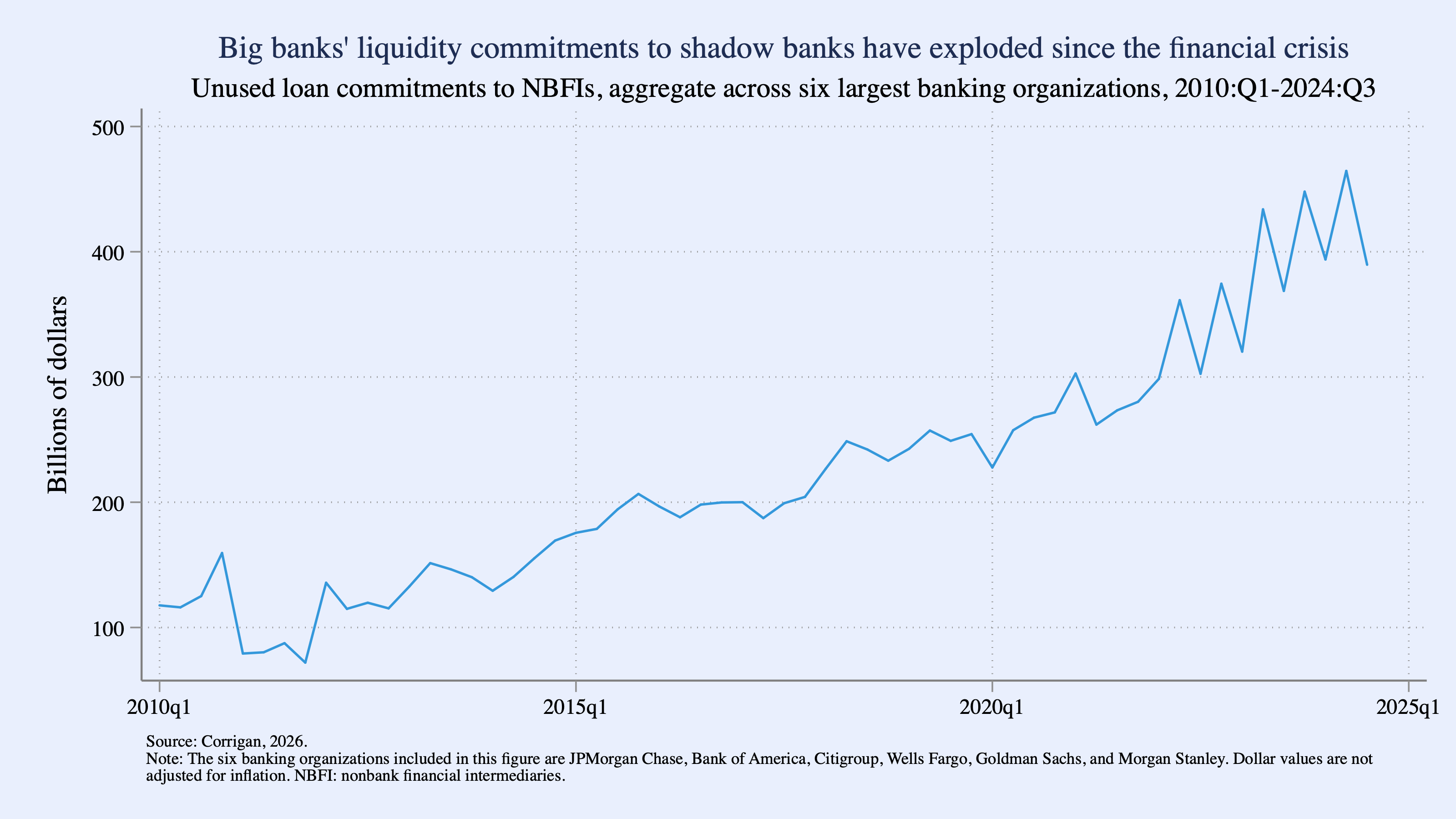 Figure 1 shows that unused loan commitments to nonbank financial intermediaries (NBFIs) by the six largest banks have increased more than 4 times since 2010, with a 21 percent increase in the first three quarters of 2025 alone. Unused commitments to NBFIs stood at $531 billion as of the third quarter of 2025, a massive liquidity commitment that would provide a significant drag on the banking sector in a crisis.