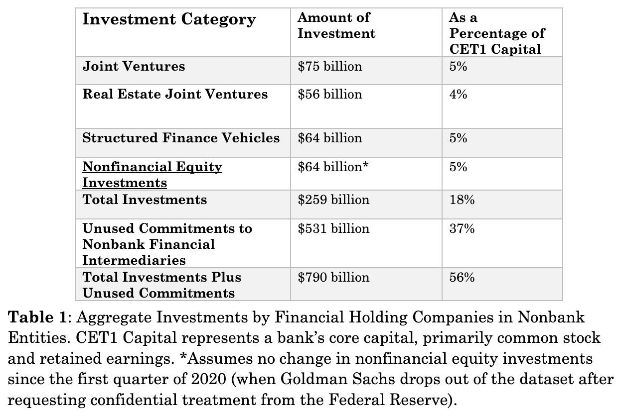 Table 1 presents public regulatory data and data obtained from the Federal Reserve through a Freedom of Information Act request on aggregate investments by the banking sector in entities where a financial holding company holds a significant equity exposure as of the end of the third quarter of 2025. It also presents data on unused loan commitments to nonbank financial intermediaries.