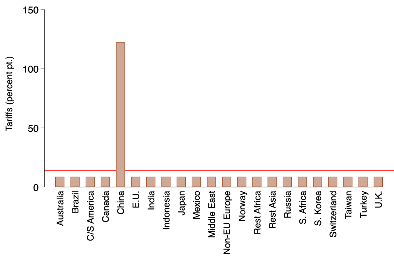 I jointly model the following components of the Trump administration’s new ad-valorem import tariffs to date: (1) 10% country-level tariffs on all goods from all trade partners, (2) 145% tariffs on all goods from China in lieu of (1), (3) sector-level 25 percent tariffs on iron/steel, aluminum, and automobile/automobile parts from all countries in addition to (1) and (2), and (4) sector-level exemptions for copper and timber/lumber, and (4) 84% retaliatory tariffs from China on all imports from the U.S.