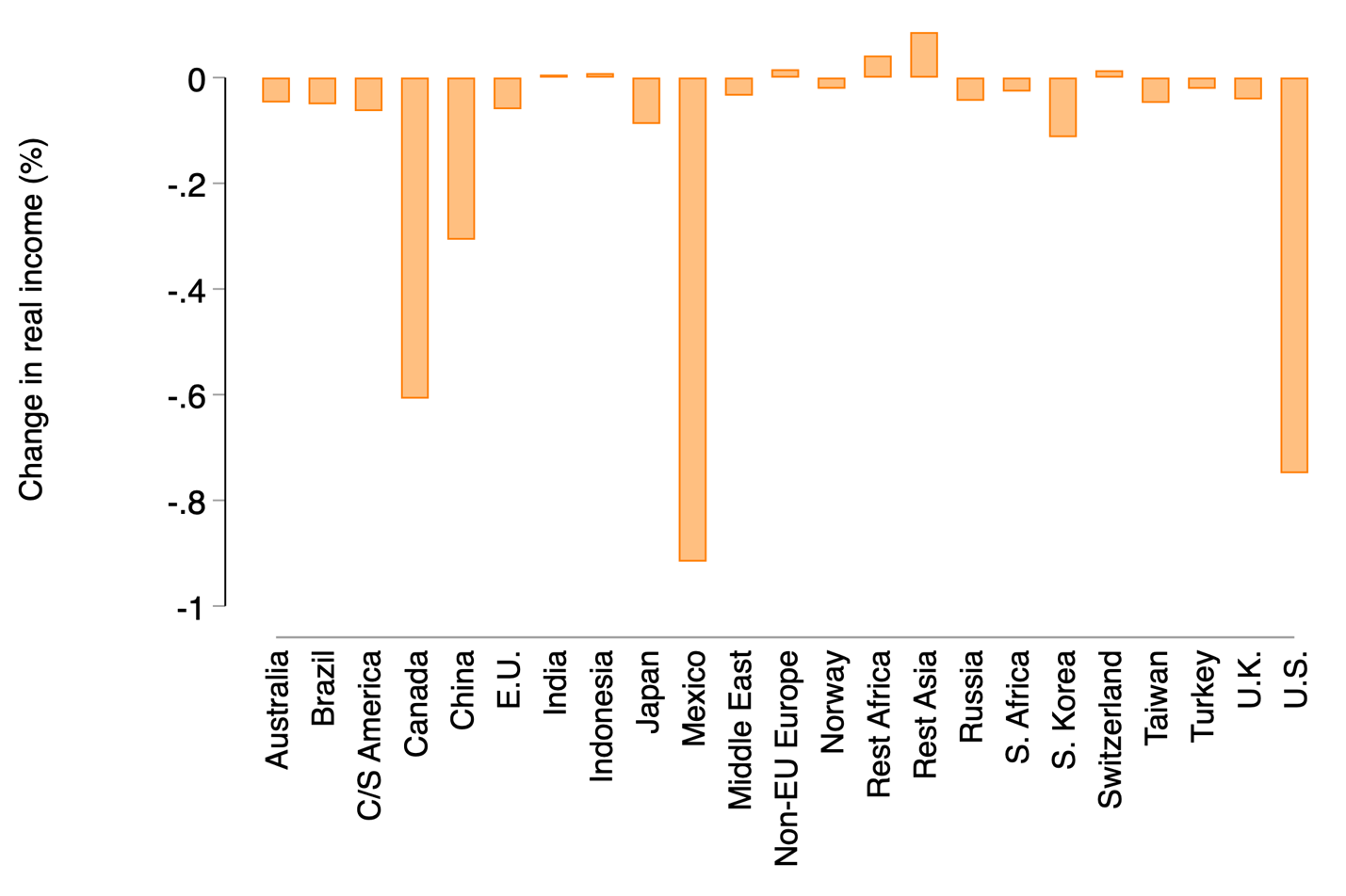 Figure 6: Trump tariffs have large impacts on real incomes in U.S., Mexico, and Canada, but not in China