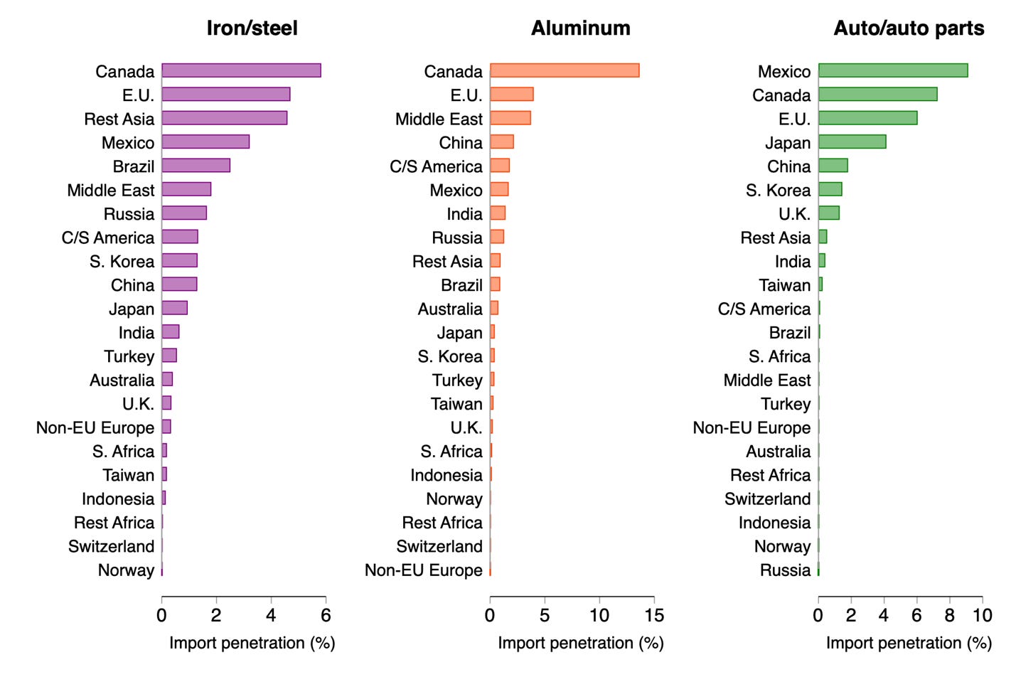 U.S. import penetration share for iron/steel, aluminum, and automobile/automobile parts across trading partners