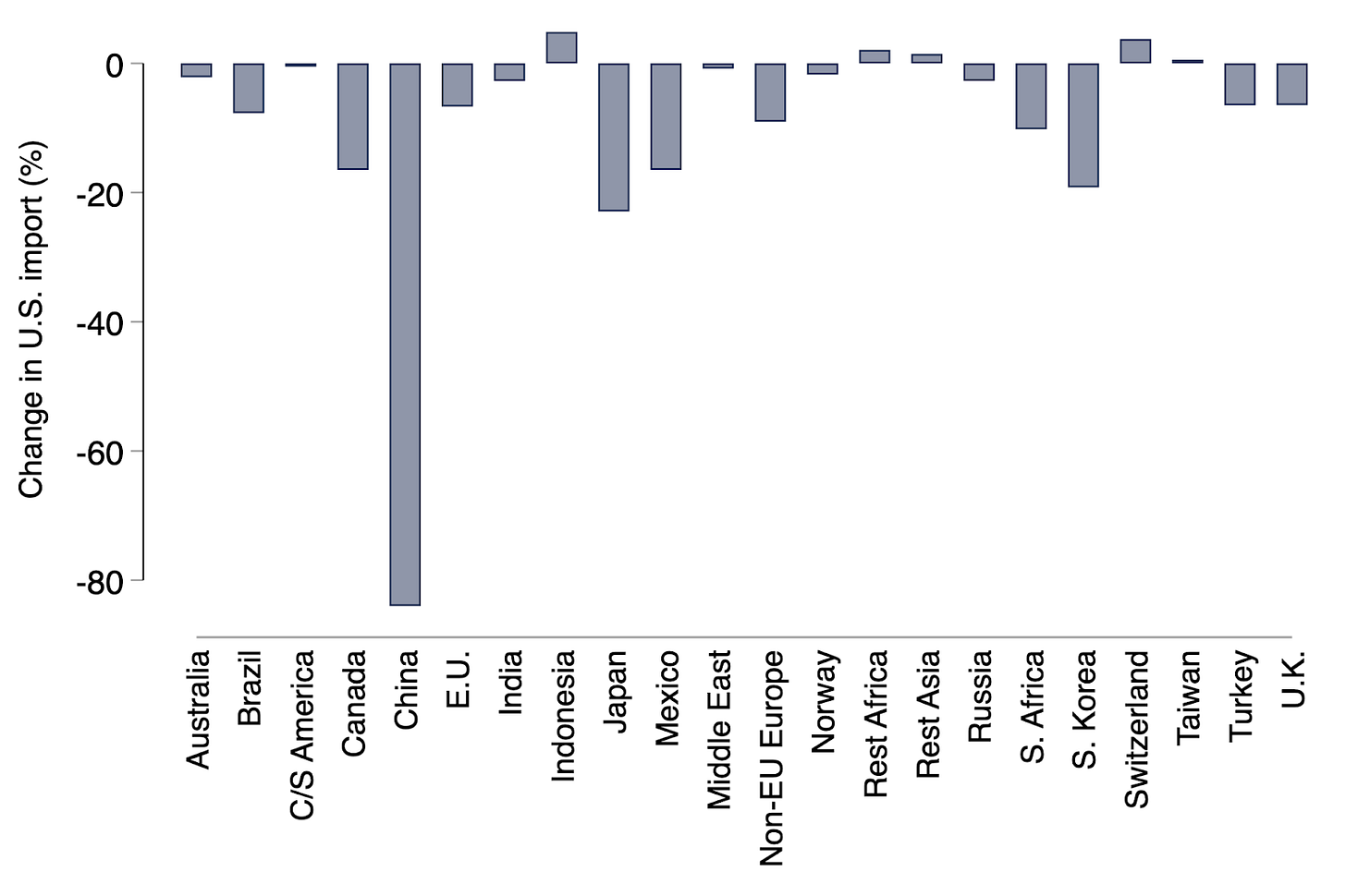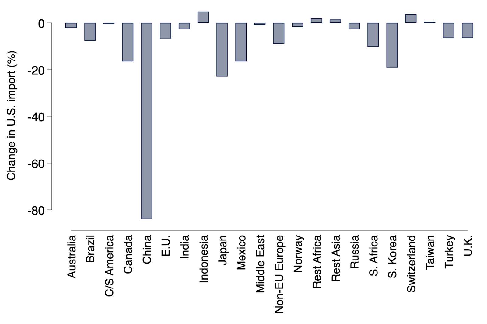 Figure 4: Trump tariffs have large large impacts on U.S. imports from many trading partners