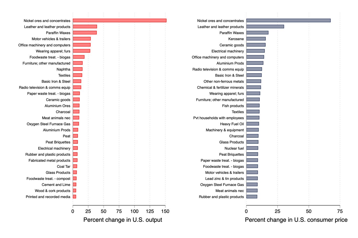 Figure 4 shows the modeled percent change in U.S. imports by trading partner due to these tariffs. Across trading partners, the average U.S. import falls by 9.3%, with imports falling by 80% from China. Falling imports are met by increased U.S. domestic production, but also with higher U.S. consumer prices. The left panel of Figure 5 shows the 30 sectors with the largest modeled increase in U.S. output due to the tariffs, while the right panel shows the 30 sectors with the highest modeled increase in U.S. consumer prices. There are many sectors with price increases exceeding 10%, many of which contain intermediate goods that will make U.S. final goods production more costly.