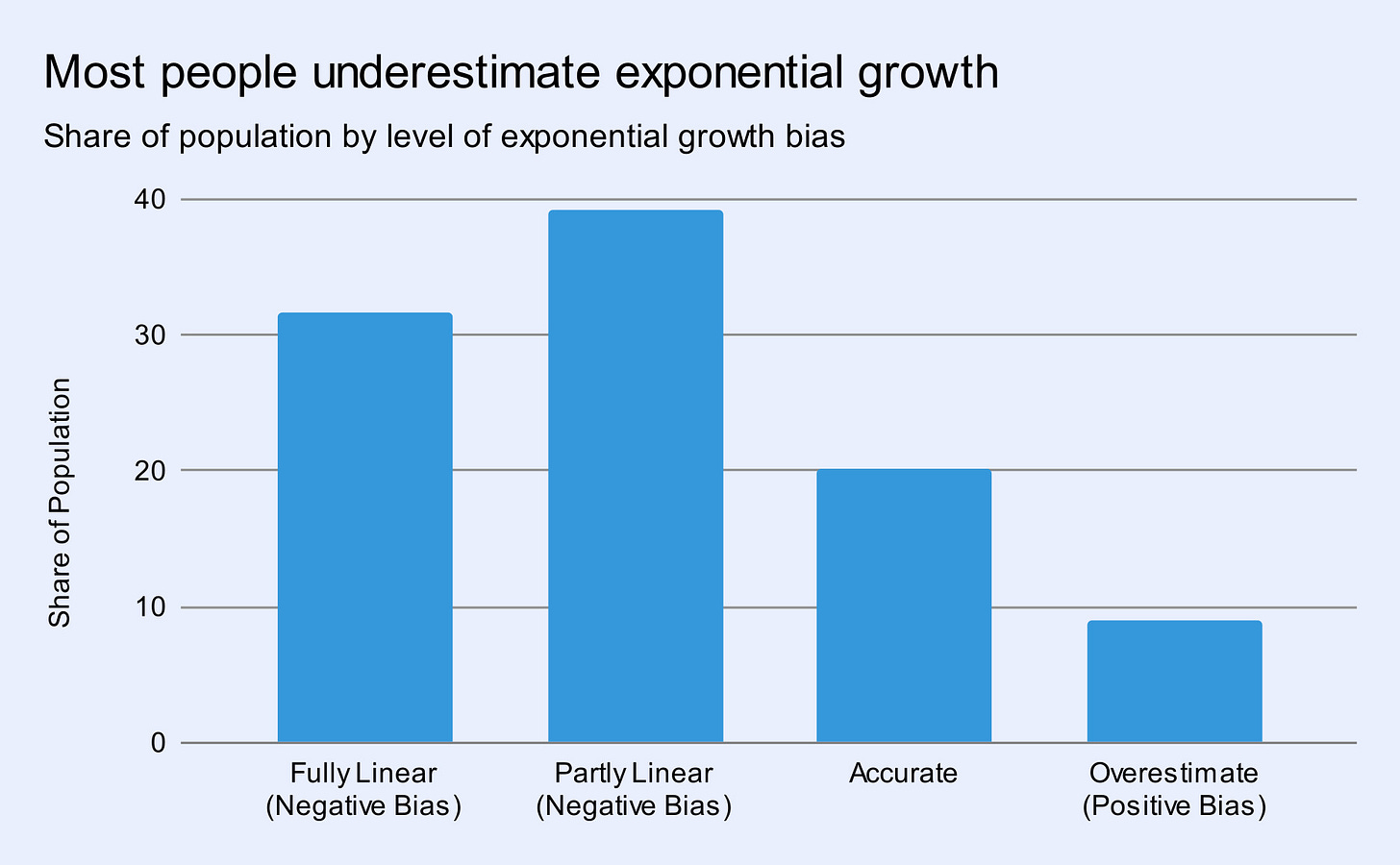 Exponential growth bias (EGB) is the tendency to misestimate how quantities grow when they compound over time. People with negative exponential growth bias perceive compound growth as if it were closer to linear growth, where their savings increase by a fixed dollar amount each period rather than accelerating as returns compound on previous returns. This bias is pervasive: research shows that approximately 70 percent of the U.S. population exhibits negative exponential growth bias, with almost a third of individuals perceiving compound growth to be linear (Levy and Tasoff, 2016; Goda et al., 2019).