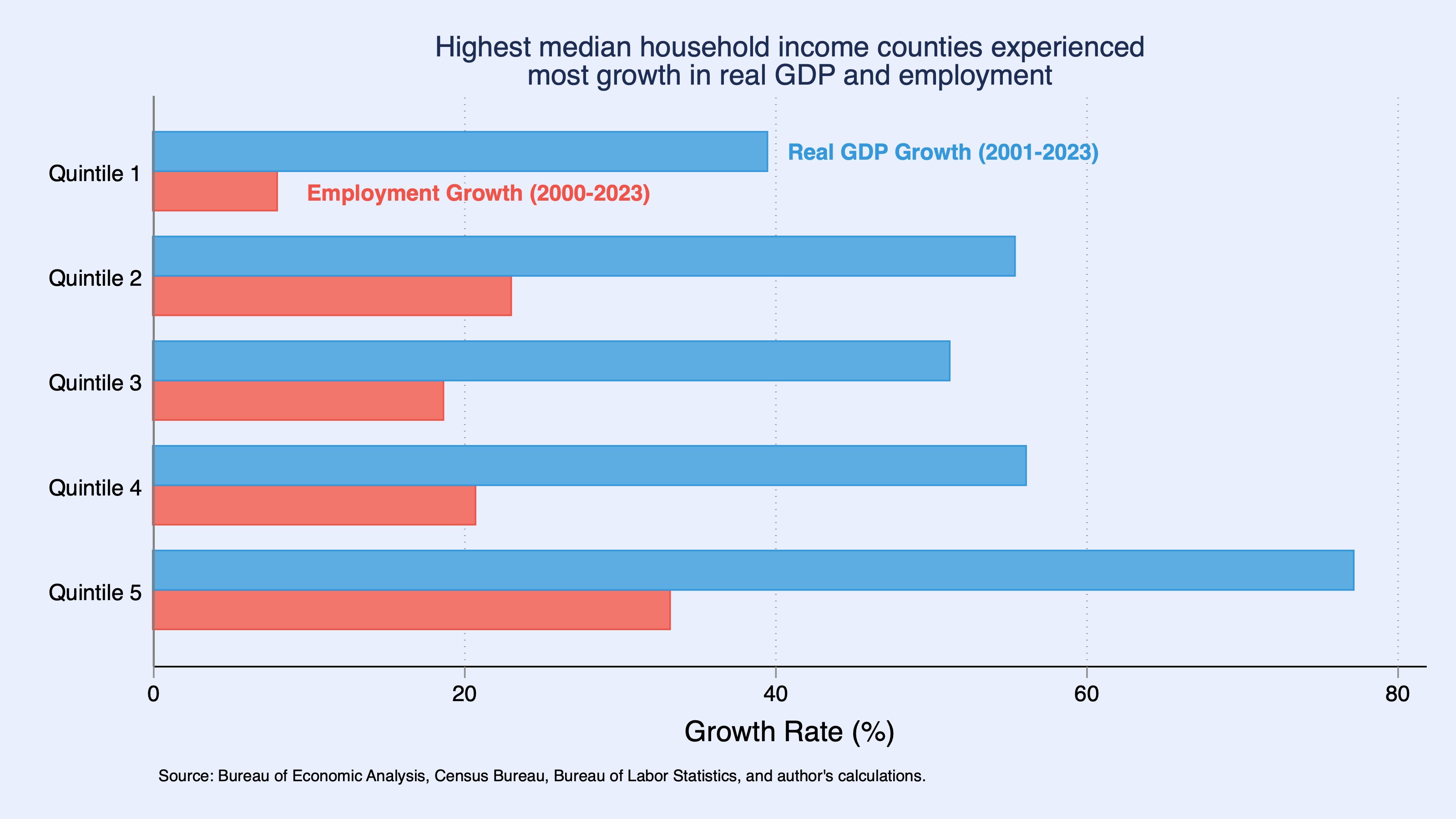 That rising (relative) importance of place is also visible in counties’ growth trajectories. Counties that ranked highest in median household income in 2000 went on to post the strongest gains in both GDP and jobs for the next two decades (Figure 2), while counties at the bottom posted the weakest performance. Between 2001 and 2023, counties whose median household income put them in the bottom fifth experienced a 39.5% increase in real GDP and an 8% increase in employment. For counties in the top fifth of the county median household income distribution, GDP grew 77.2% and employment grew 33.2%.