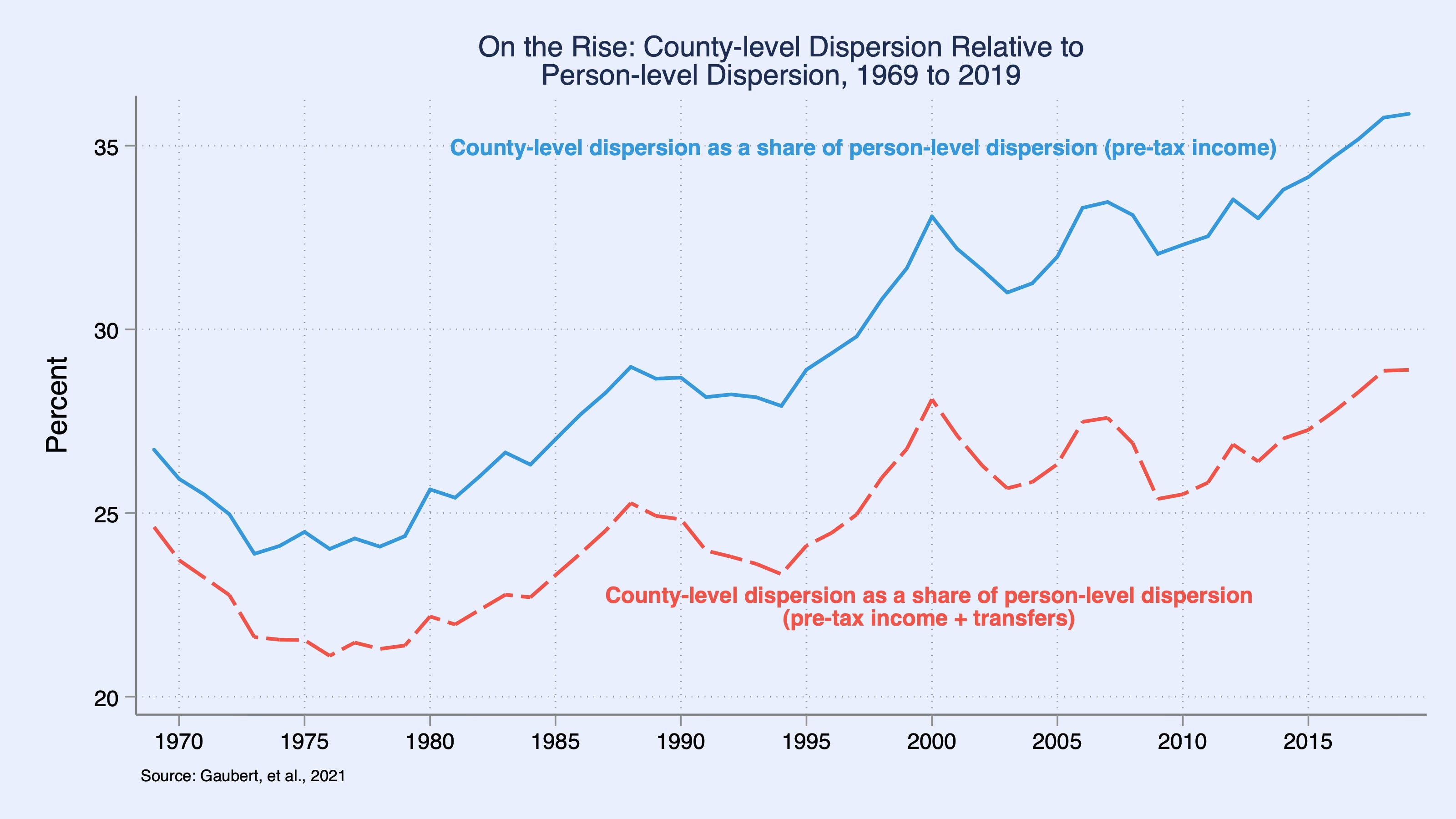 By 1980, regional convergence weakened and largely disappeared by the late 1990s. Since then, higher-income places have tended to grow faster than lower-income ones. Figure 1 also shows that county-level dispersion in income accounts for a growing share of person-level income dispersion since the late 1960s. By 2019, this share hit an all-time high for the pre-tax measure of income and was near a series high for a measure that also considers federal transfers.